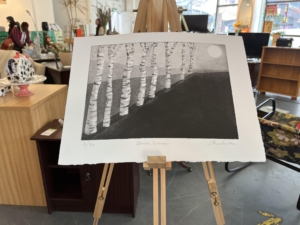 I can’t really name a favourite.  Because there are so many and they are all very interesting. There’s a great range of techniques and approaches. I’ve seen lino cuts, I’ve seen wood cuts, oil paintings, drawings. There’s a lot of variety and I think people should be welcome to come and have a look round themselves and see what takes their fancy.